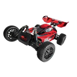 The Hyper Go Desert Buggy on a scale of 1:14 reaches a top speed of 55 km/h thanks to its brute drive. High-quality components such as the aluminium oil-pressure shock absorbers, metal CVD drive shafts, cardan shafts, gearbox and differentials ensure that this off-road racer has a long service life. An active fan on the engine enables optimum cooling. The adjustable chassis, which sits on an aluminium chassis plate, ensures extreme directional stability.