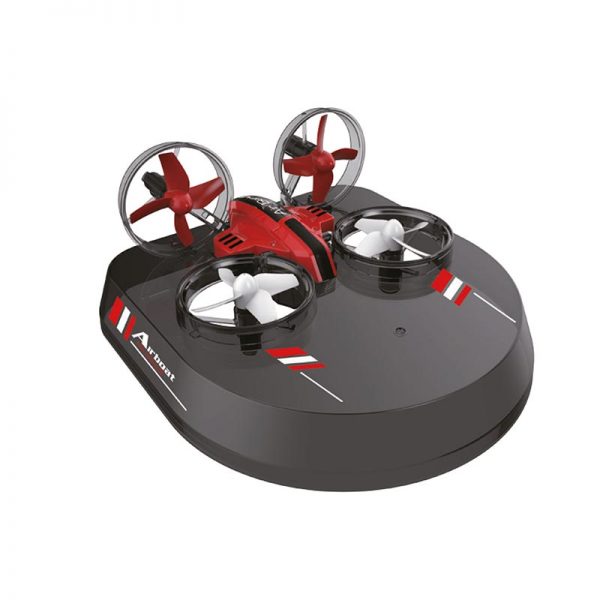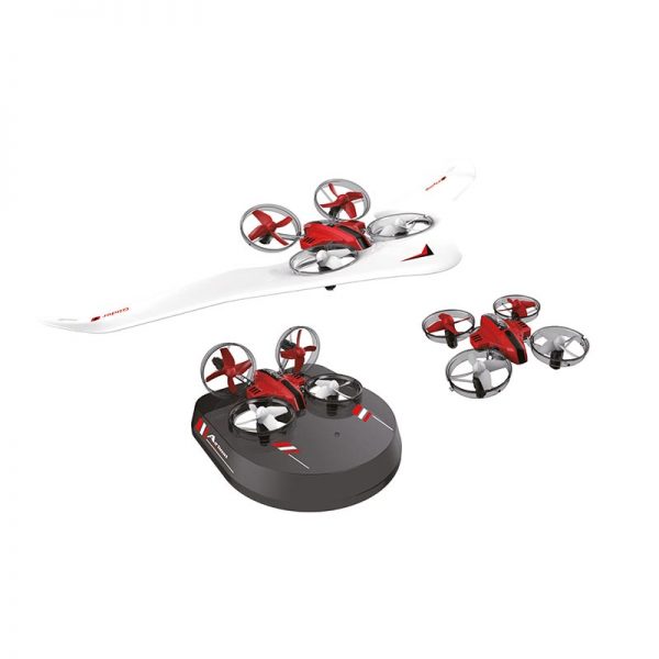 No matter if air or ground. The Air Genius is ready for all elements. The jack-of-all-trades or miracle whirlpool among copters. As a compact and manoeuvrable drone with 6-axis stabilization, 360 ° flip mode, switchable LED lighting, three speed levels, interference-free 2.4GHz radio remote control and beginner-friendly headless mode (orientation mode). In connection with the ground base, the Air Genius is transformed into a lively hovercraft that whizzes rapidly over the ground. Cool drifts and high-speed drives are now easily possible. The third variant is also really fun: connected to the delta wings, the drone seems to float effortlessly through the air. Indoor and outdoor.