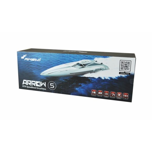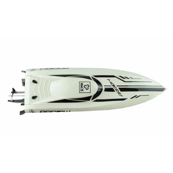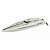 A speedboat of the extra class with absolute top equipment for the ultimate high-speed experience on the water. Everything that is needed for fun is included: a strong brushless engine, water cooling, a non-interruptible 2.4GHz control system with a well-handed pistol remote control and a water-protected electronics. The 2200mAh LiPo battery with 11.1V also includes travel times of 4 – 6 minutes with a top speed of up to 50km/h. The driving stability of this fantastic race boat is ensured by the trim and trim plates that are already installed on the boat. A full-fledged servo-controlled rowing system give you an additional safe feeling and let the model chase you comfortably around the corners at a rapid speed. The integrated water cooling system ensures safe operation of the electronic components in the model. Should damage to the propeller nevertheless occur, a replacement propeller is included with the set, as is the associated assembly tool. The hull is made of very impact-resistant plastic. All together convey an extremely high-quality impression, which is rounded off by the dynamic white. In case you have stuck, the boat also has a reverse gear (only in an emergency, because the wave is sucked through the shaft through the shaft into the boat over the shaft).