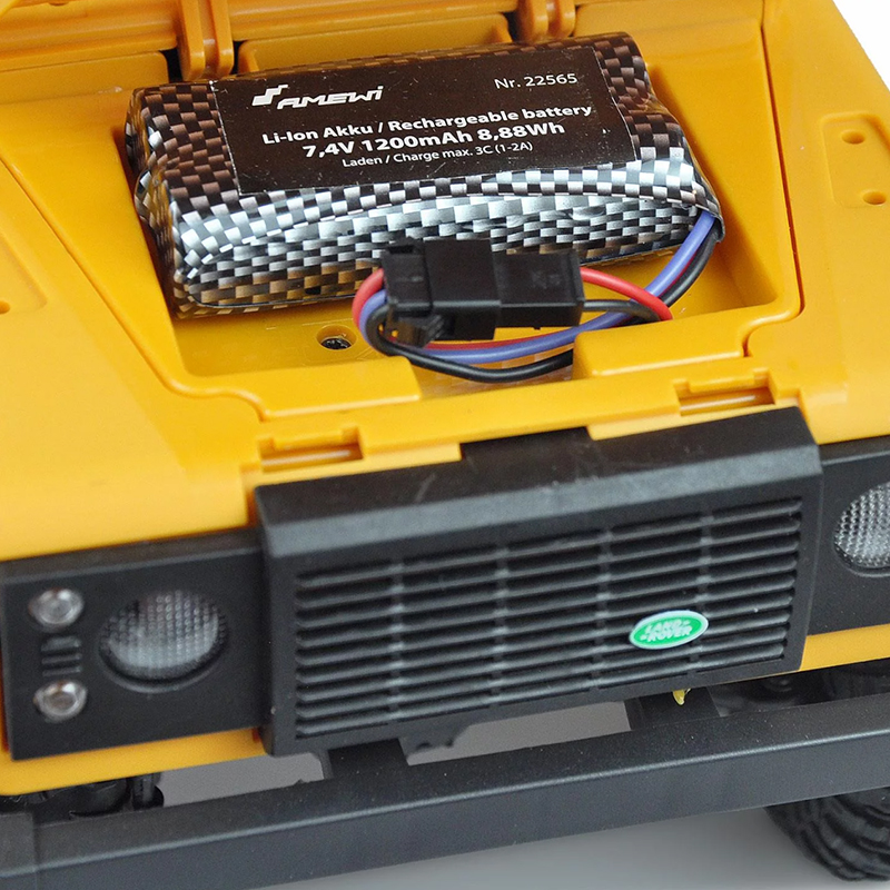 Camel Trophy reloaded – licensed replica of the legendary Landrover D-90 off-road vehicle in a beautiful scale look with full LED lighting including turn signals, which impresses in 1:12 scale for off-road use: The model combines good driving characteristics with great technology and ingenious looks. Even the smallest details are based on the original. All attachments such as windscreen wipers, lighting covers, mirrors or air intakes are included. All parts are plugged in and do not have to be glued. A roof rack is already assembled and offers space for your own ideas, such as an optional tool box, spare wheels, etc. Every scale fan’s heart beats faster here. The bonnet can also be opened by hand: underneath there is a compartment for the large Li-Ion 7.4V 1200mAh battery.
