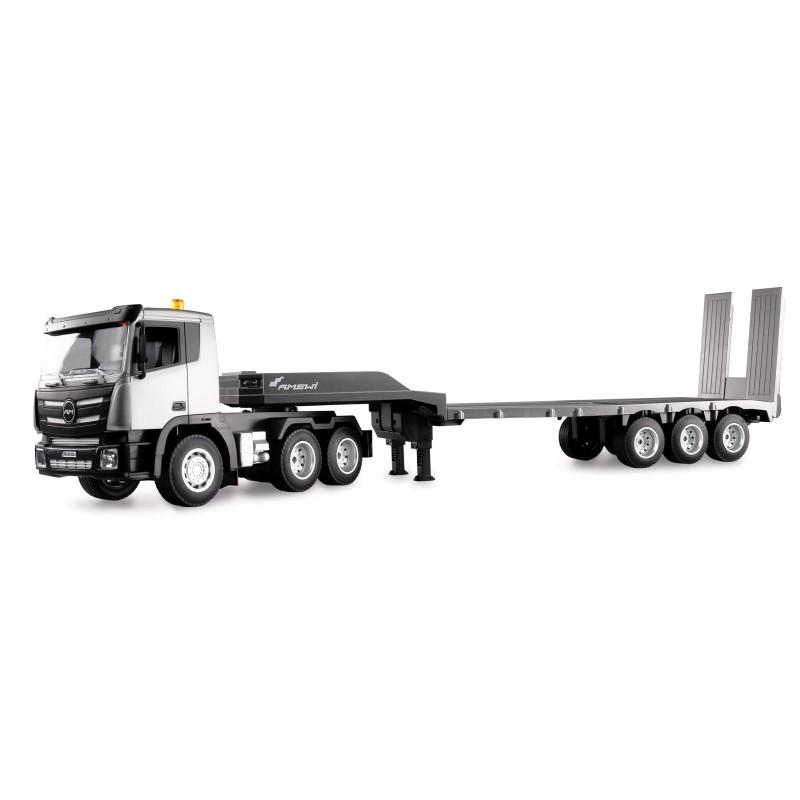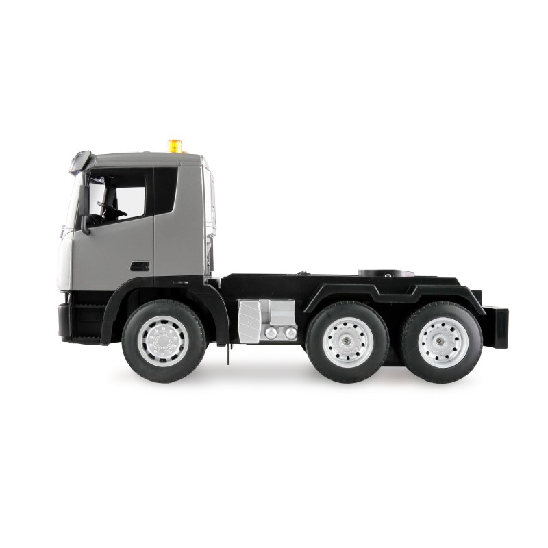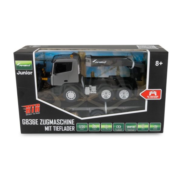 Unlimited fun with the remote-controlled G836E tractor unit with low-loader on a scale of 1:24 – this detailed model is a must-have for all lorry fans aged 8 and over. Various goods can be transported from A to B. The combination of tractor unit and detachable low-loader offers a wide range of play options: This means that the truck can also drive off on its own, making many exciting adventures possible. In addition, the supports and the ramp of the low-loader can be adjusted manually.