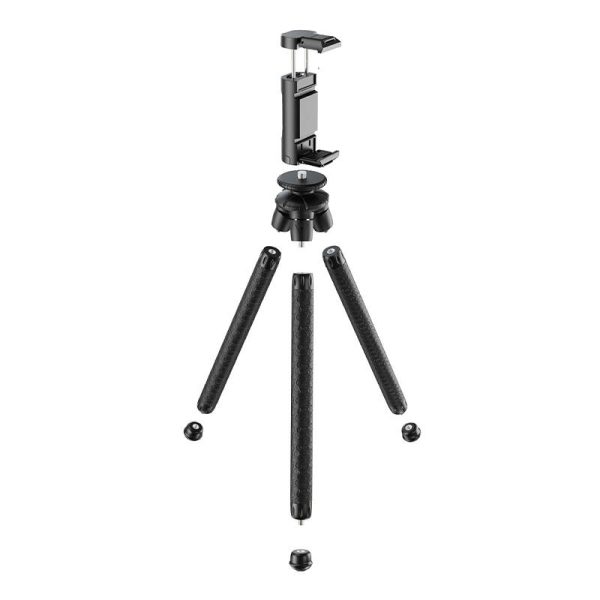 The tripod is distinguished by its detachable legs and clip, which significantly increases its versatility. The top of the unit can rotate 360°, allowing you to easily adjust the angle of your shot without having to move the entire tripod. In addition, a non-slip pad on the bottom provides stability on a variety of surfaces, and its detachability opens up new configuration possibilities for the user.