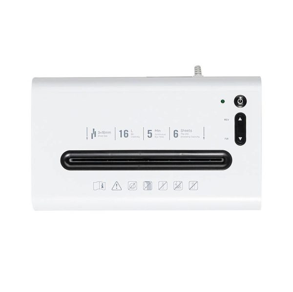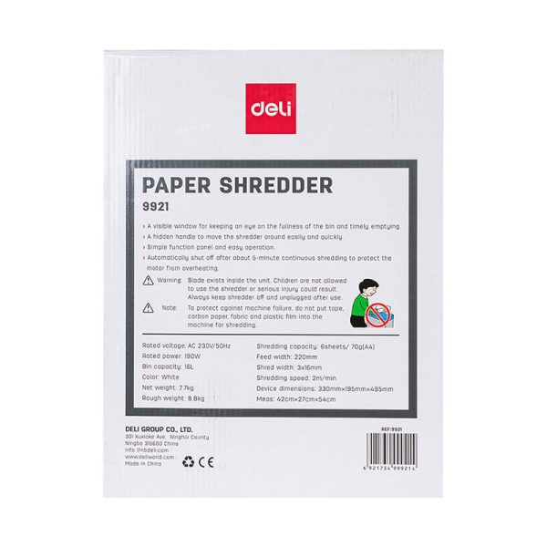 Now you can shred unnecessary documents even faster. Deli brand shredder can cut up to 6 sheets of A4 70g at a time. The device cuts paper into small strips with a length of 16mm. Fast and efficient – perfect for any office!