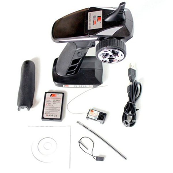 The set includes the FS-GT2B transmitter, FS-GR3F receiver, instruction on the CD, battery for powering the transmitter, USB cable for charging the apparatus and an additional grip.