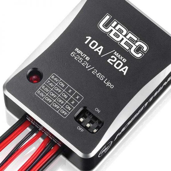 The UBEC is an external DC-DC switching module which draws its voltage from 2-6S lipos. The module regulates the voltage to a previously defined value which is required by the receiver or other electronic devices. This is extremely stable and the output current is pearmanently up to 10A or briefly at 20A.