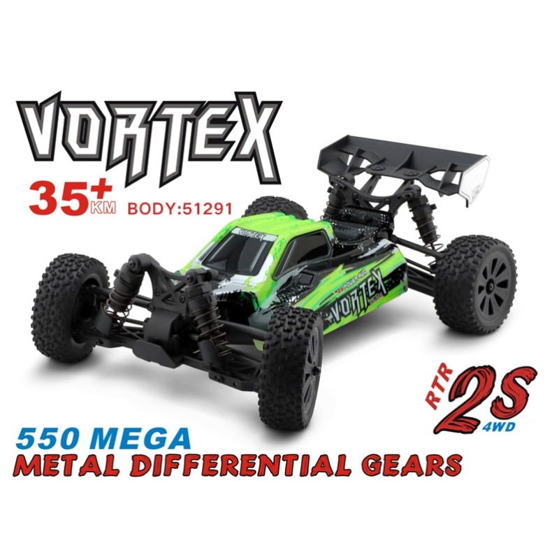 With its robust and durable chassis, the Vortex is built to withstand the toughest challenges. The vehicle is powered by a powerful RC550 brushed motor and a water-resistant 60A ESC, providing the buggy with lightning-fast acceleration and awesome speed.