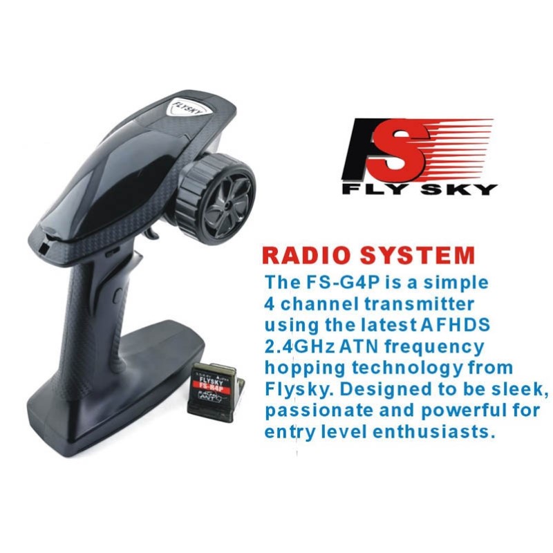 - Splash-proof electronic components and 4-channel 2.4GHz FS G4P radio with fail-safe.
