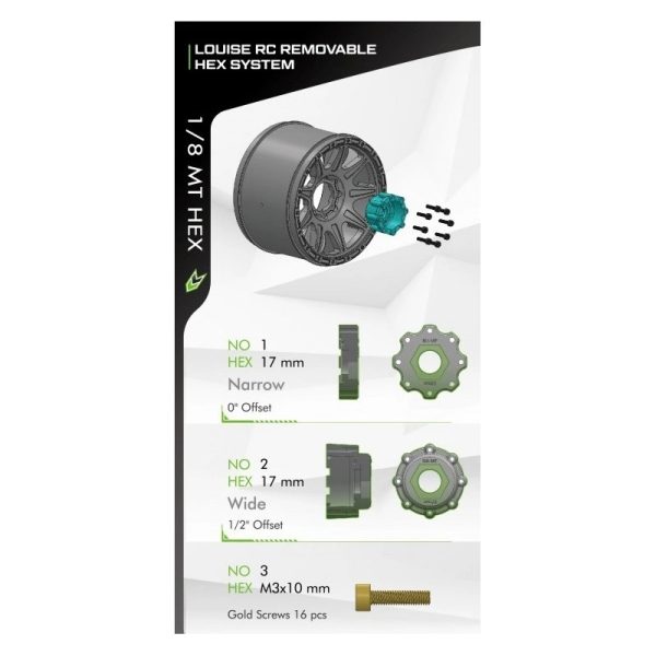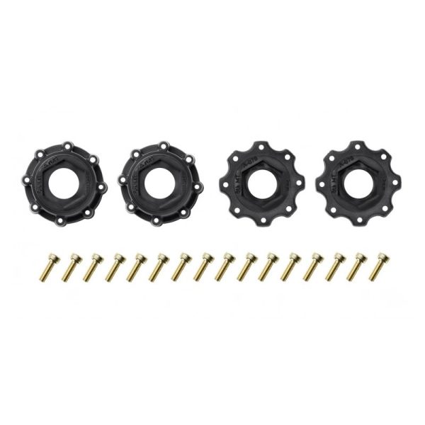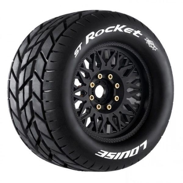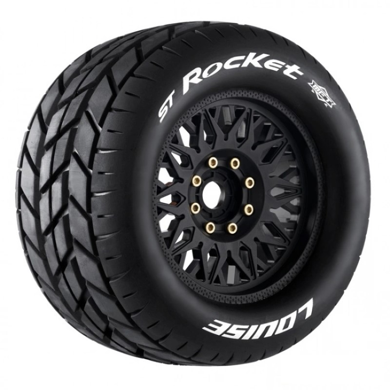 This is the new belted Louise ST-ROCKET Stadium Truck tires for 1/8 scale trucks with exchangeable off-set 17mm hexes (Fits trucks like Traxxas E-REVO, SLEDGE & MAXX etc). The ST-ROCKET tires are equipped with MFT technology and a sporty rubber compound with good grip but still limits the amount of tire expansion due to the built-in MFT cord (Micro Fiber Tech). The ST-ROCKET tire tread is perfect for street and smooth surface bashing. The new black nylon wheel has a removeable hex hub that makes it fit most 1/8 scale trucks with a 17mm hex front and/or rear!