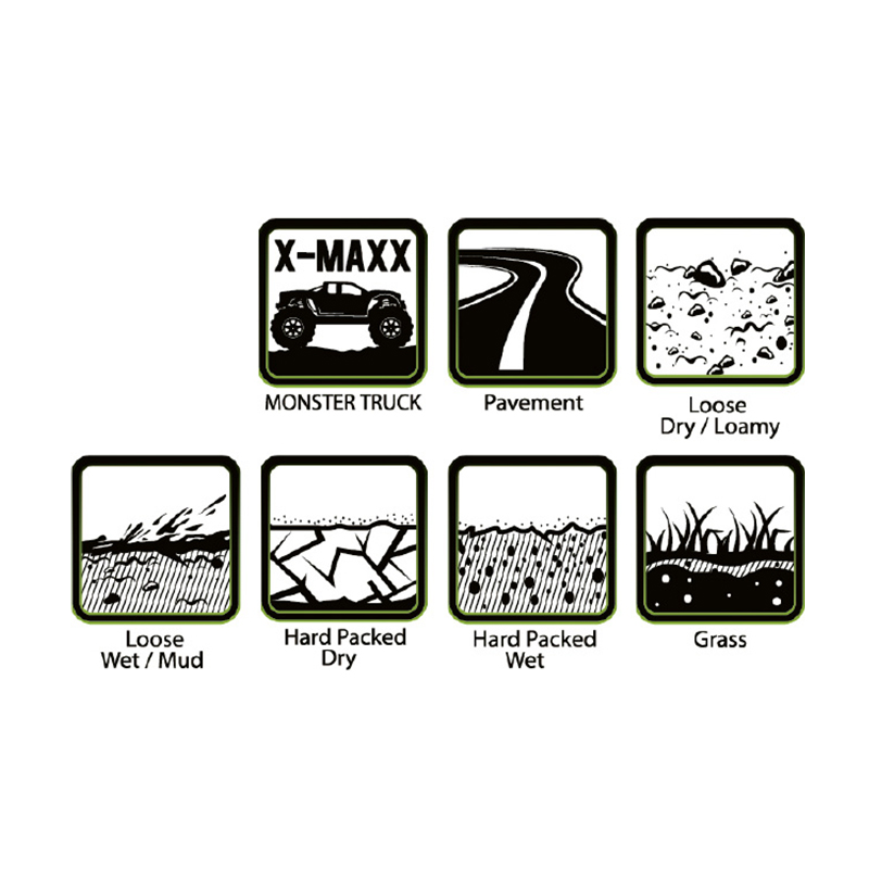 Truck tires for the high performance Traxxas X-MAXX. The new X-ROWDY tire has the new incorporated MFT technology that is engineered to limit tire expansion (normally refered to as “balooning”). They are mounted on a new very sturdy black nylon 7-spoke wheels with a X-Maxx specific 24 mm hex. The X-ROWDY tire is a good allround tire for most semi-smooth surfaces including grass and hard-packed clay!
