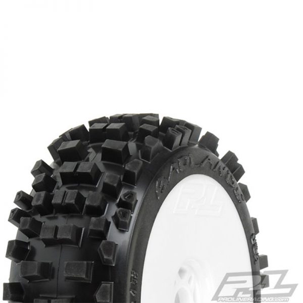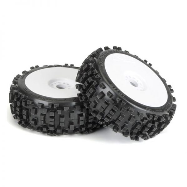 - Badlands 1:8 Buggy All-Terrain Tires mounted on White Velocity V2 wheels (2 pcs)