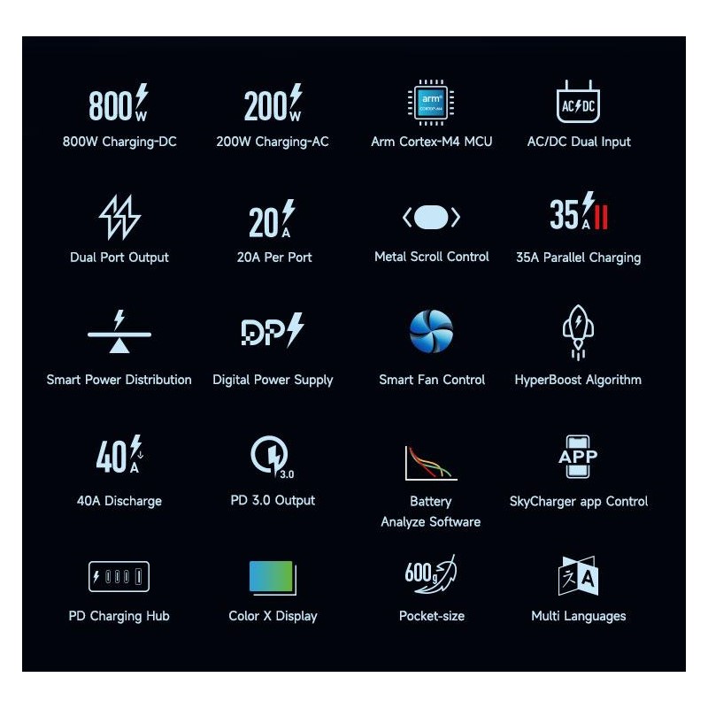 - Charger power: AC: 200W MAX / DC: 800W MAX