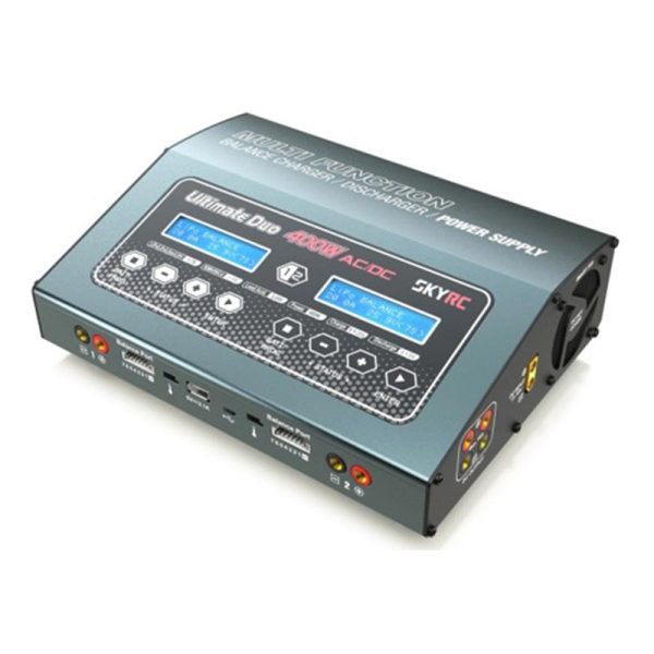 SkyRC Ultimate Duo 400W can be used to power devices that require alternating current (DC). The charger delivers 150 W on channel 2, converting standard 100-240 V AC from the mains socket to 6-15 V DC