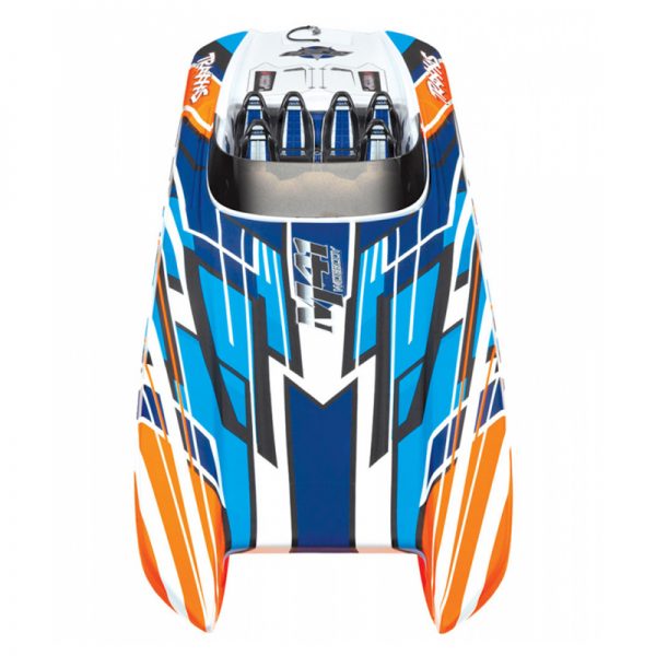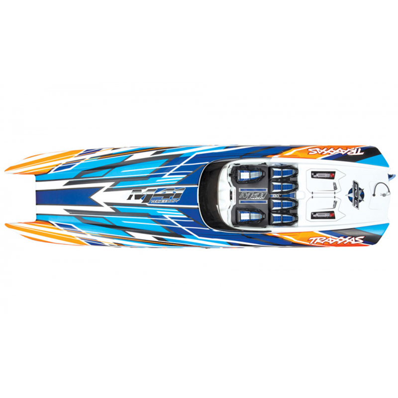 The DCB M41 Widebody catamaran, designed by DCB (Dave’s Custom Boats) founder Dave Hemmingson, is the largest model offered in the DCB M-Series. With its precision sculpted design and a pair of Mercury Racing 1350 engines, it speeds across the water at 175mph! Traxxas has faithfully captured the incredible looks and performance of the DCB M41 in a detailed scale replica that is versatile, fun, and fast. The catamaran hull has been accurately reproduced to deliver the speed, stability and confidence that the full-size M41 is famous for, allowing you to have fun wherever your marine adventures take you. The M41 replica is equally at home blasting across the waves at the lake on a fun run or exploiting its 50+mph speed on a favorite stretch of smooth water. The razor sharp handling lets you carve turns with authority and precision and yet, offers easy control while cruising by the shore.