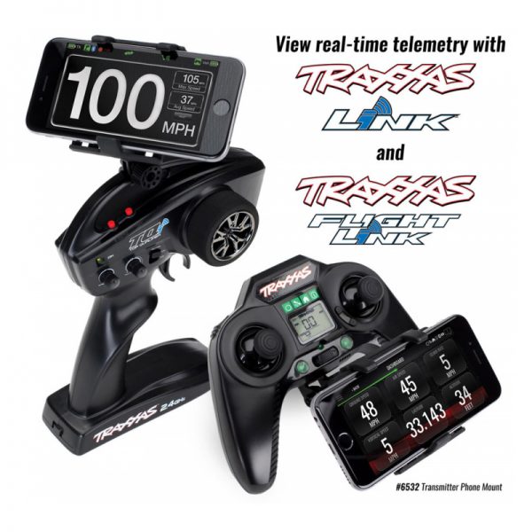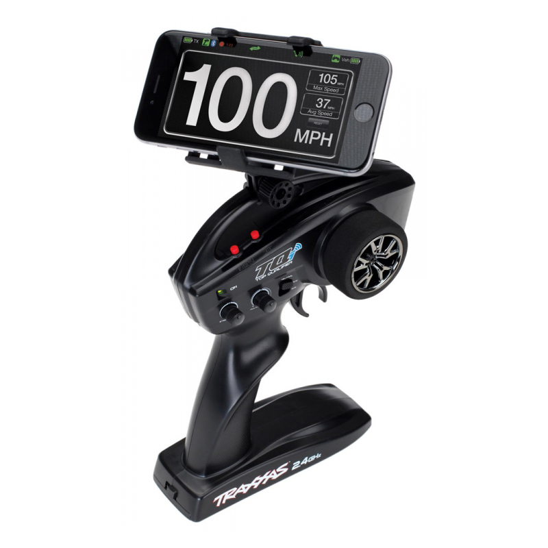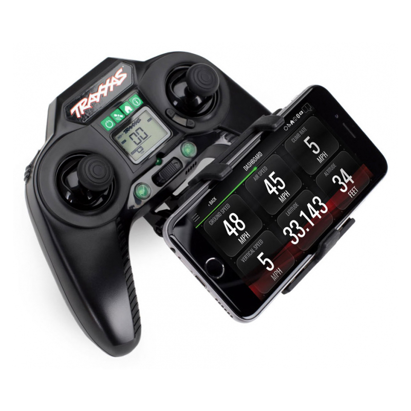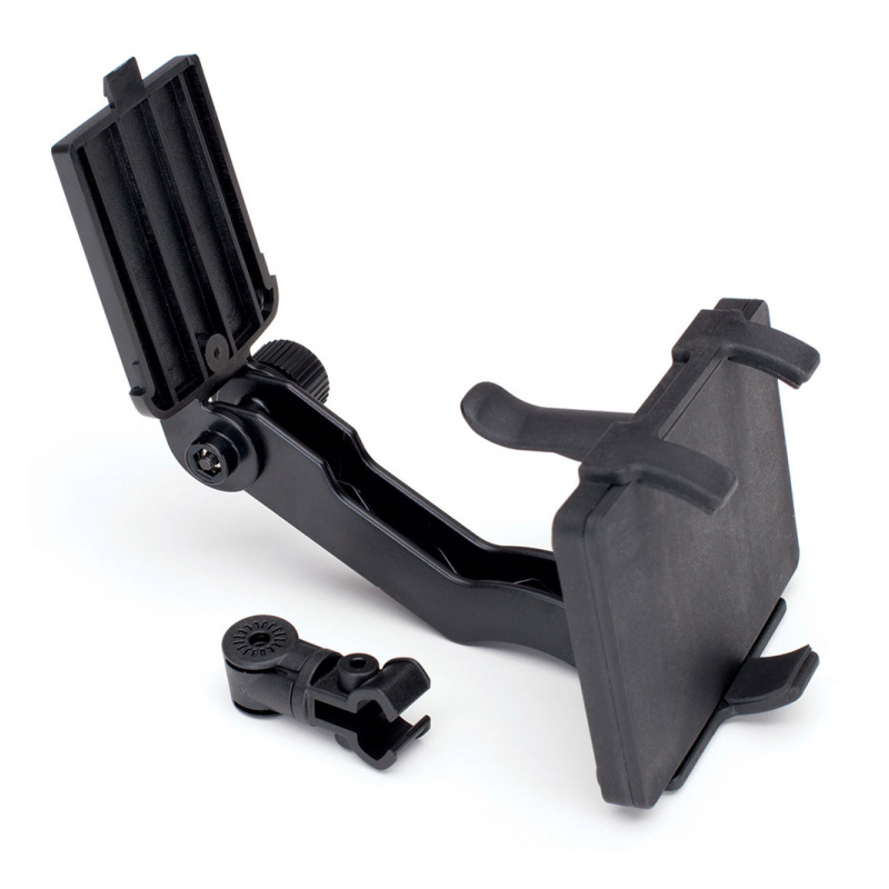 The new Traxxas RC Transmitter Phone Mount provides a convenient mounting base for your mobile device on TQi and Aton transmitters. This mount makes monitoring real-time telemetry and adjusting settings simple, keeping your device secured to the radio for easy access. Spring loaded clamps hold a variety of mobile devices to the mount, and the base swivels and tilts to customize the position. Get the most from Traxxas Link telemetry accessories and apps with the new Transmitter phone mount.